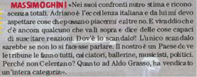 Mancuso di schiera a sorpresa ma non troppo a favore delle esternazioni con cui il cantante ha choccato Sanremo e buona parte dei cattolici italiani. Nel momento in cui dice che i preti dovrebbero fare di più il loro mestiere di uomini dello spirito, capaci di toccare i problemi primi e ultimi dell’esistenza, del Paradiso e della vita eterna, anziché parlare di politica, “difficile dargli torto”. “Celentano? un personaggio a volte discutibile, ma sempre interessante, un credente alla sua maniera, probabilmente se non avesse fatto la battuta ‘bisogna chiudere Avvenire e Famiglia Cristiana’, ma semplicemente che i due giornali vanno fortemente riformati, se non rivoluzionati, non avrebbe suscitato lo stesso scandalo, ma avrebbe aperto un dibattito interessante. Penso però che abbia fatto un errore di analisi ad accomunare le due testate: il quotidiano è davvero la “voce del padrone”, mentre il settimanale è molto più libero.