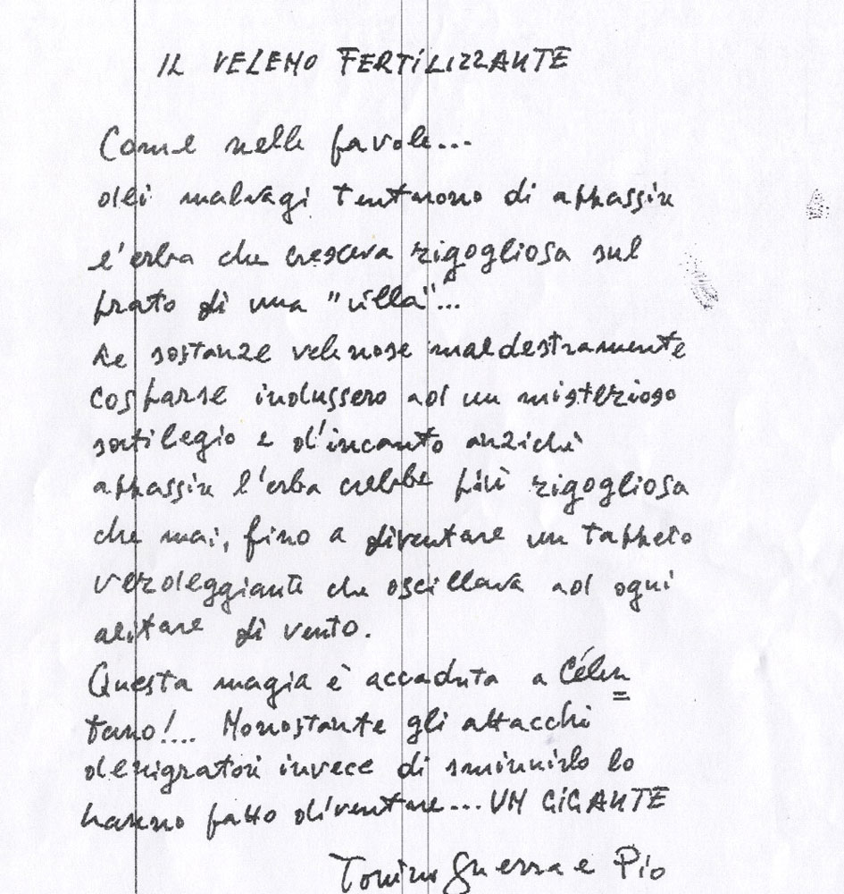 Le sostanze velenose maldestramente cosparse indussero ad un misterioso sortilegio e d’incanto anziché appassire l’erba crebbe più rigogliosa che mai, fino a diventare un tappeto verdeggiante che oscillava ad ogni alitare di vento.