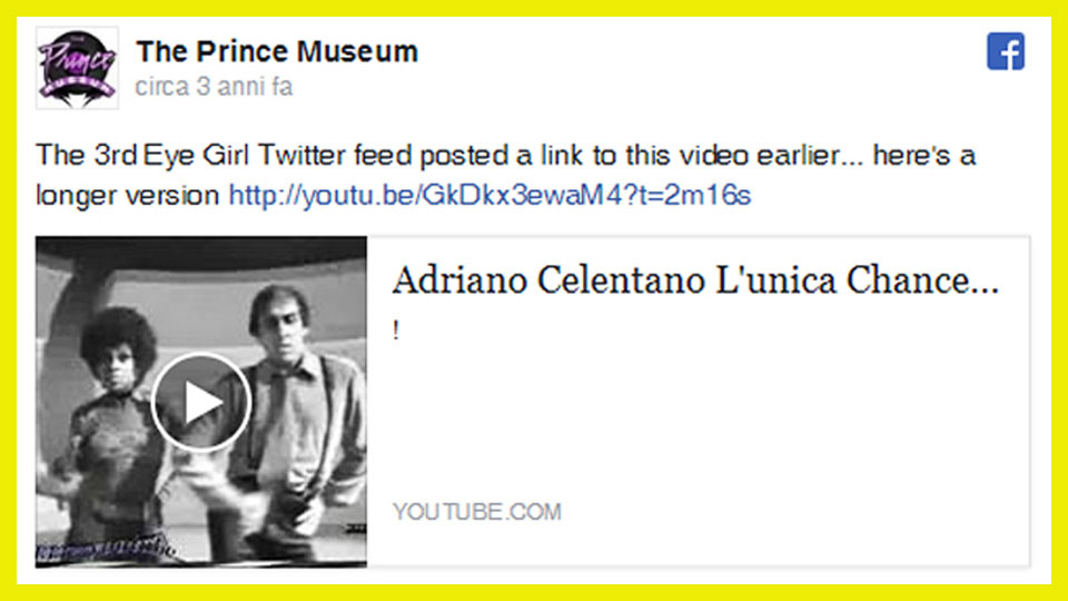 Forse perché a Prince piaceva il funk e “L’unica chance” è una canzone funk al 100%. Purtroppo non è possibile ritrovare il tweet originale del 2013 dal vecchio profilo ufficiale (Prince/3rdEyeGirl), perché nel 2014 l’artista chiuse ed eliminò tutti i suoi canali social per poi riaprire, solo nel 2015, un nuovo profilo su Twitter; tuttavia sul web qualche traccia rimane sempre. Lo dimostra lo screenshot dell’account facebook “The Prince Museum”, punto di riferimento di molti fan dell’artista, riportato oggi sulla community di Celentano. Sono ancora presenti online anche molti commenti di fan che nel 2013 chiedevano informazioni su questo brano italiano postato dal loro idolo.Da Ansa 26 Aprile 2016
